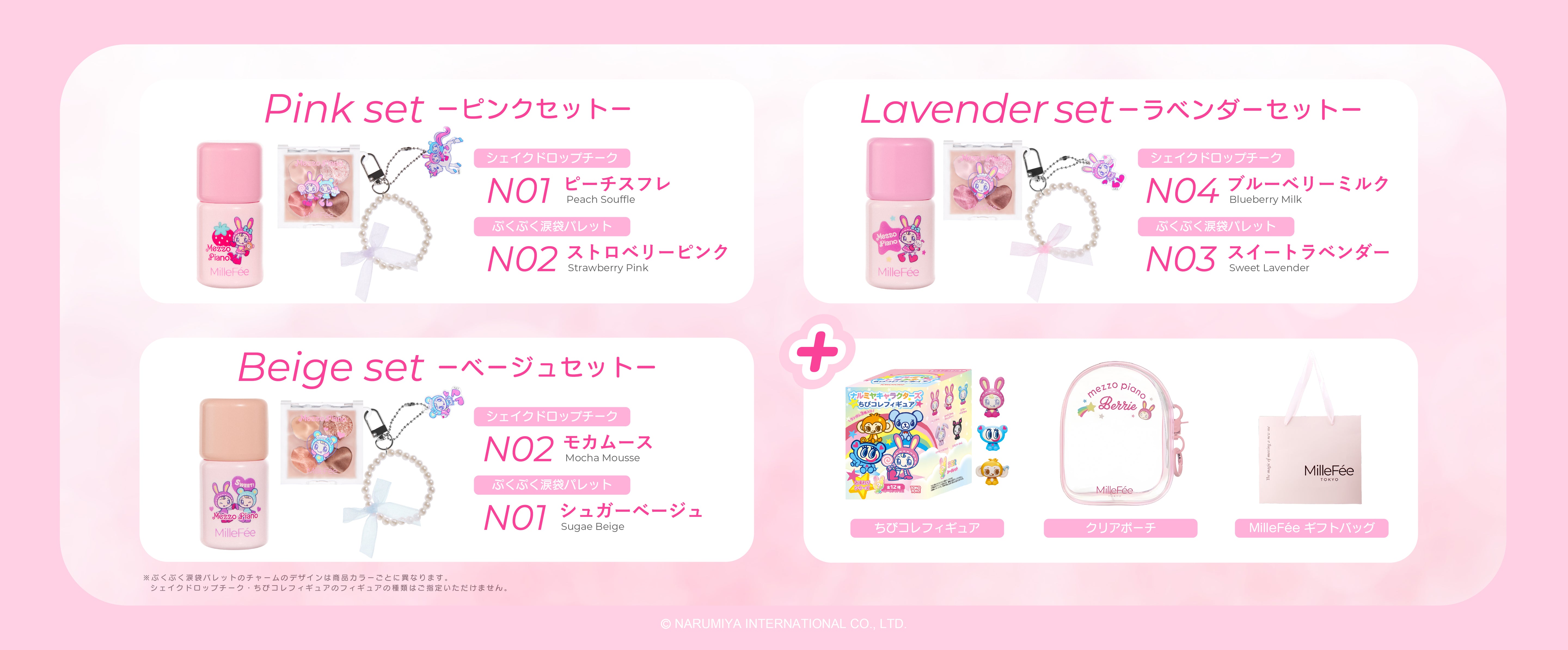【ベージュセット】シェイクドロップチーク N02モカムース/ぷくぷく涙袋パレット N01シュガーベージュ/ちびコレフィギュア(内容量:ランダム 3個)/クリアポーチ/ギフトバッグ