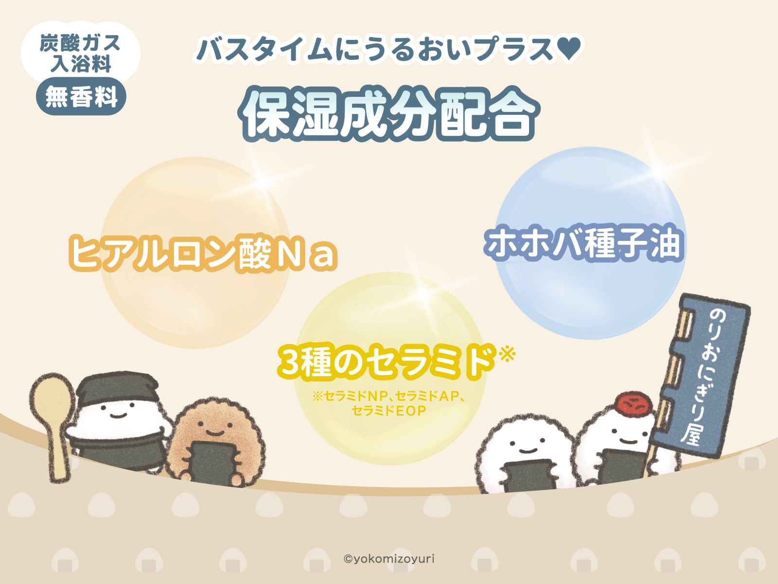入浴料全成分:炭酸水素Na、クエン酸、炭酸Na、硫酸Na、PEG-8、水、ヒアルロン酸Na、ホホバ種子油、セラミドNP、セラミドAP、セラミドEOP、フィトスフィンゴシン、ペンチレングリコール、ステアロイルグルタミン酸Na、フィトステロールズ、ステアリン酸ポリグリセリル-10、ステアリン酸、アスパラギン酸、キサンタンガム"