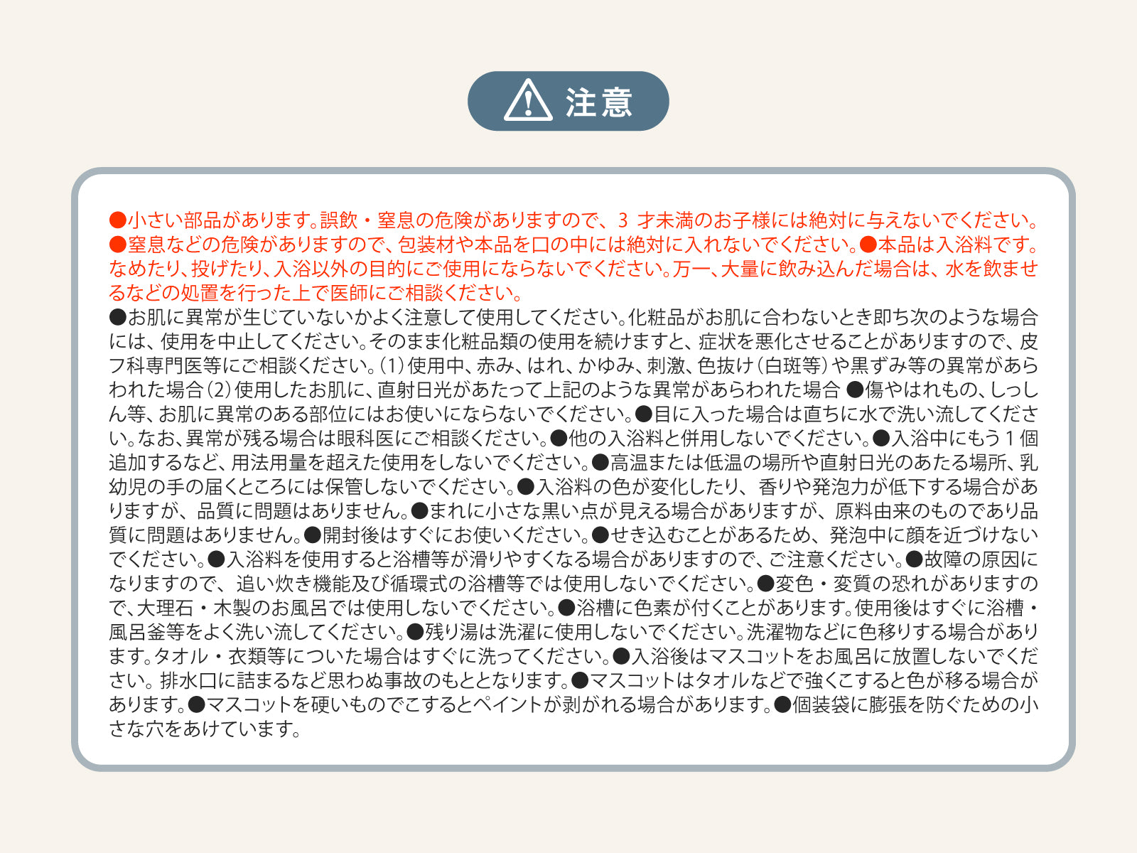 窒息などの危険がありますので、包装材や本品を口の中には絶対に入れないでください。本来の用途以外には使用しないでください。お肌に異常が生じていないかよく注意して使用してください。お肌に合わないときは、ご使用をおやめください。